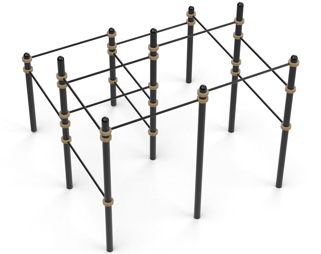 Данная конструкция состоит и 9 столбов разной высоты и 15 перекладин. Перекладины располагаются на разных высотах, что подходит для выполнения разнообразных фристайл-элементов для любителей и продвинутых паркурщиков.