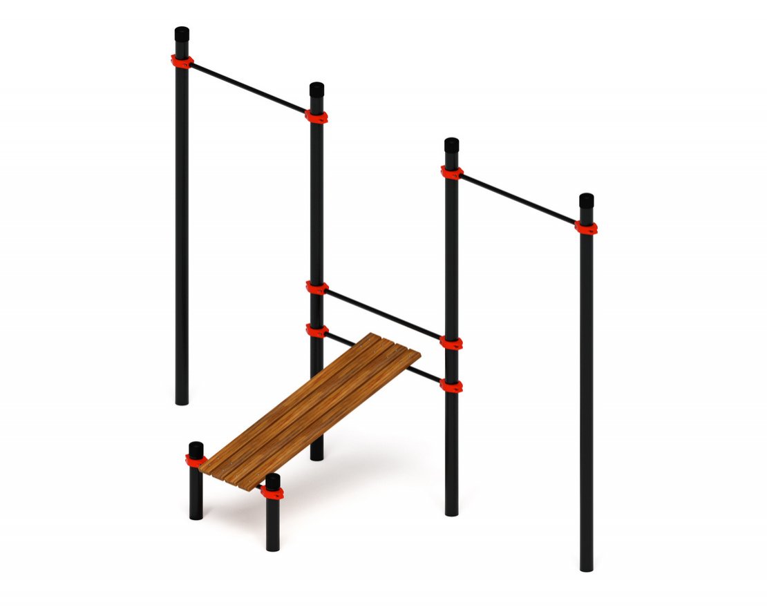 Комплекс для занятий на улице представляет собой набор опорных столбов, перекладин и лавку для упражнений. Он состоит из шести опорных столбов: четыре высотой 2 600 миллиметров и два — 500 миллиметров. К высоким столбам при помощи специальных хомутов крепятся две перекладины длиной 1 200 миллиметров для подтягиваний.