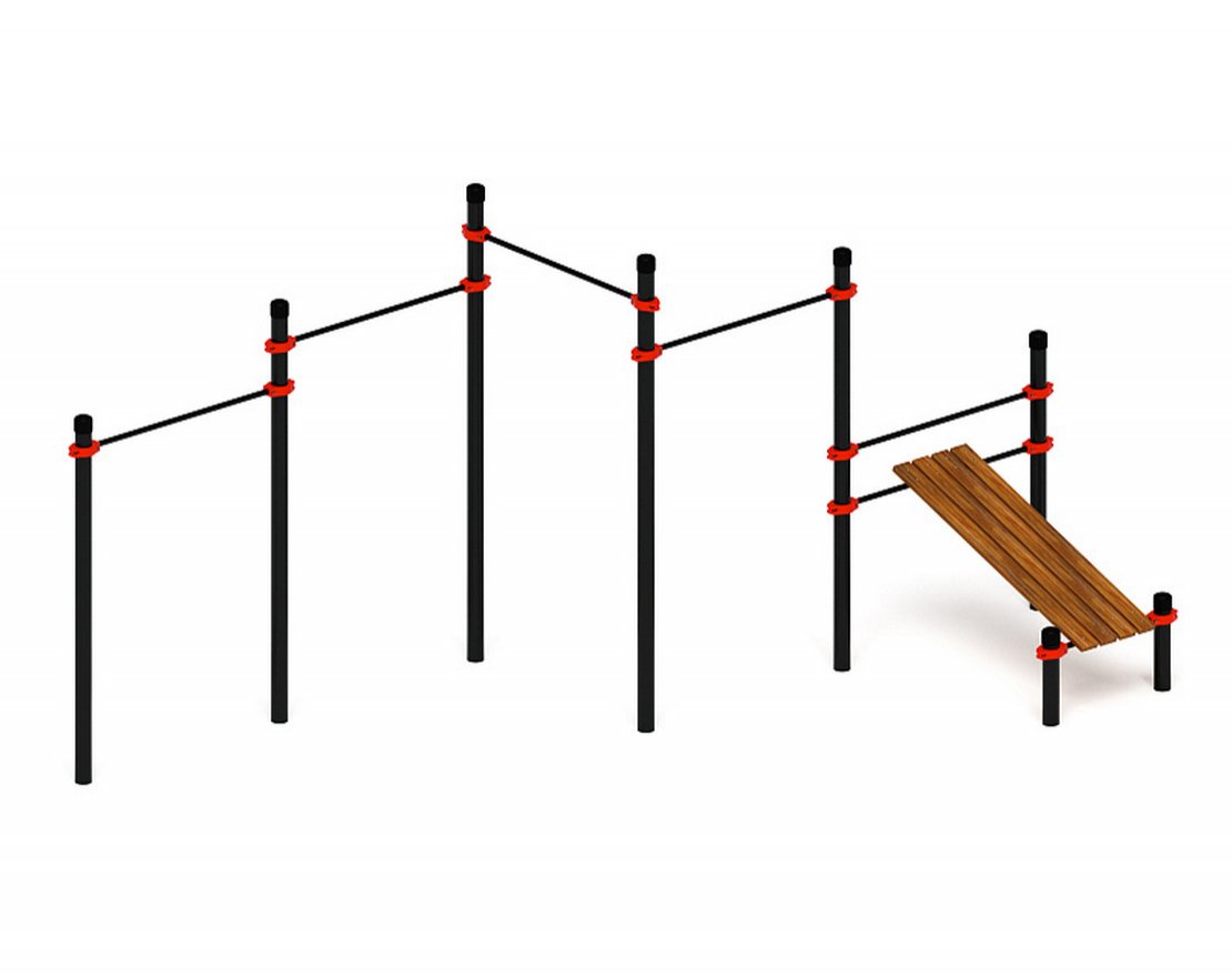 Комплекс представляет собой набор спортивных снарядов, которые предназначены для выполнения различных упражнений на открытом воздухе. Он состоит из восьми опорных столбов и дополнительных элементов, таких как перекладины, лавка и хомуты.