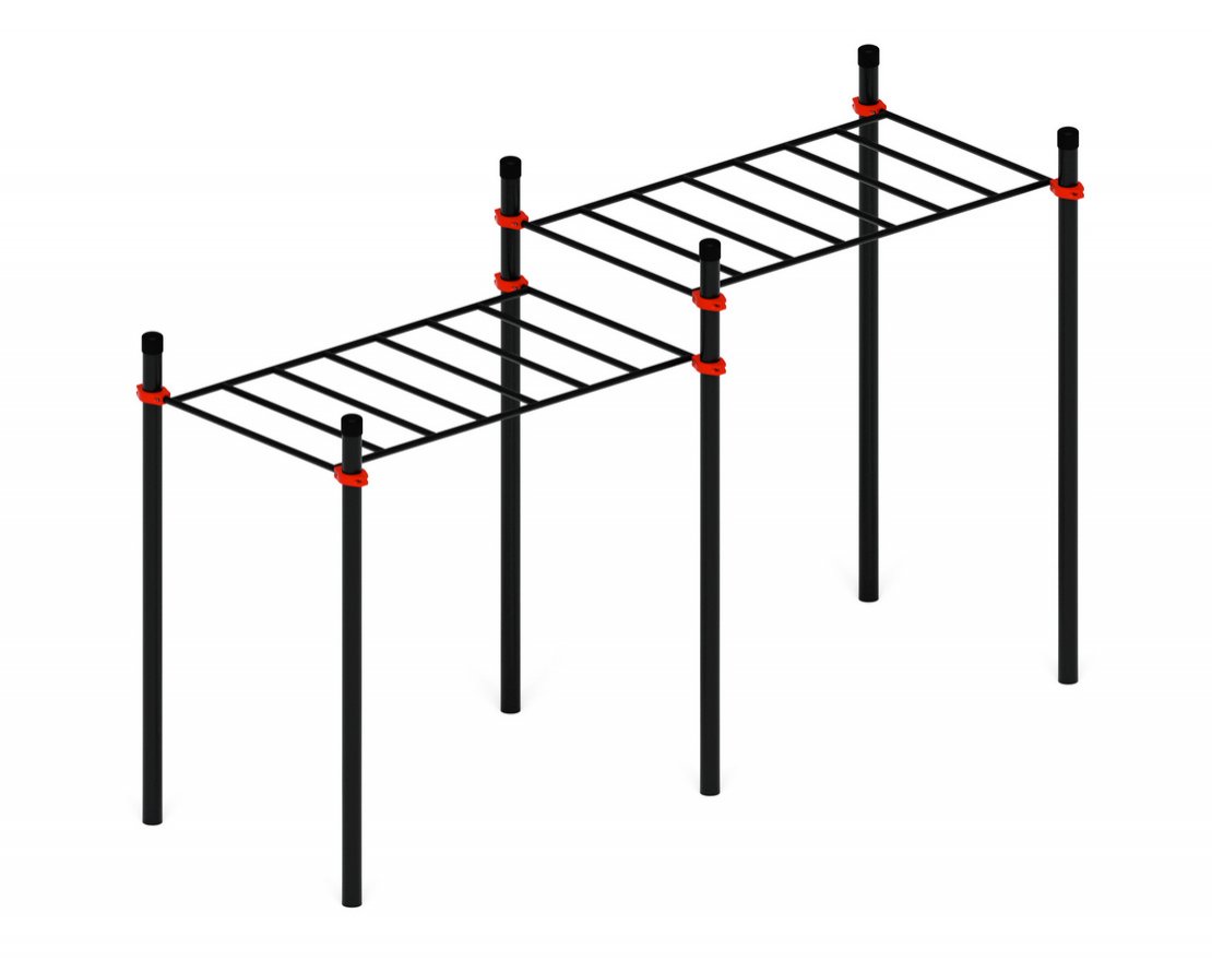 Комплекс для занятий на свежем воздухе представляет собой устойчивую и прочную конструкцию, состоящую из шести опорных столбов, выполненных из стальной трубы диаметром 89 мм и толщиной стенки 3,5 мм. Комплекс включает два рукохода, которые крепятся к столбам на удобной высоте 2 600 мм (4 шт.) и 2 300 мм (2 шт.).
