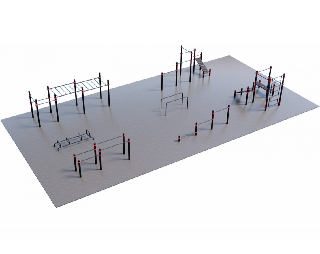 В комплект входят различные спортивные снаряды, такие как перекладины для подтягиваний и отжиманий, брусья, лавка для упражнений, турники, комплекс с рукоходом и турниками, а также турник с возможностью выполнения упражнений на пресс.