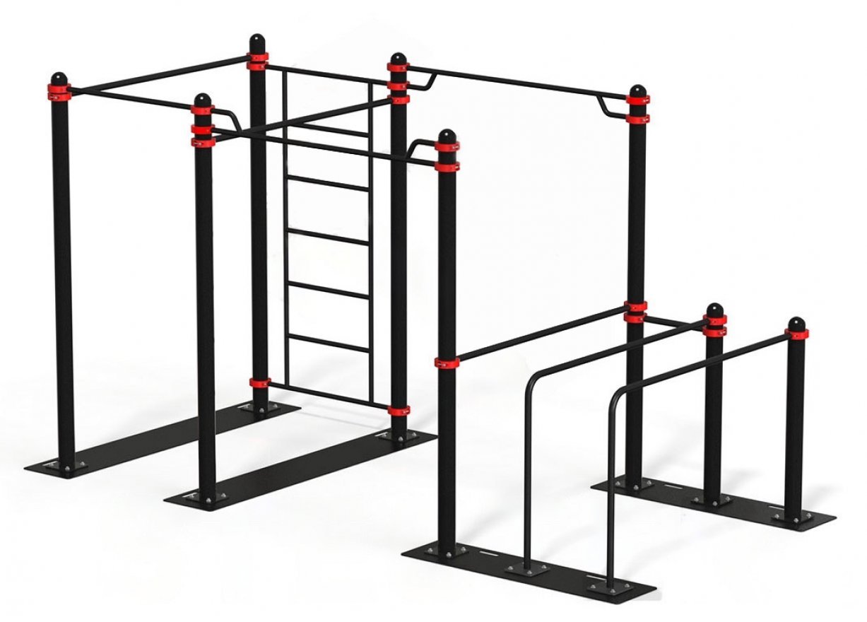 Спортивный комплекс — сборная металлическая конструкция, которая состоит из опорных столбов, перекладин, брусьев, шведской стенки и полусферических заглушек. Комплекс легко монтируется и демонтируется благодаря разборной конструкции и хомутам для крепления элементов.