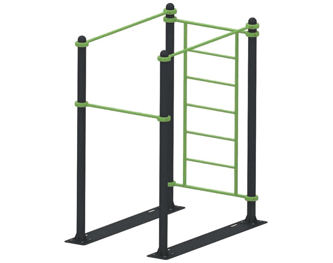 Конструкция комплекса состоит из трёх турников и лестницы, которые регулируются по высоте благодаря хомутам. Это позволяет настроить комплекс под рост каждого пользователя.