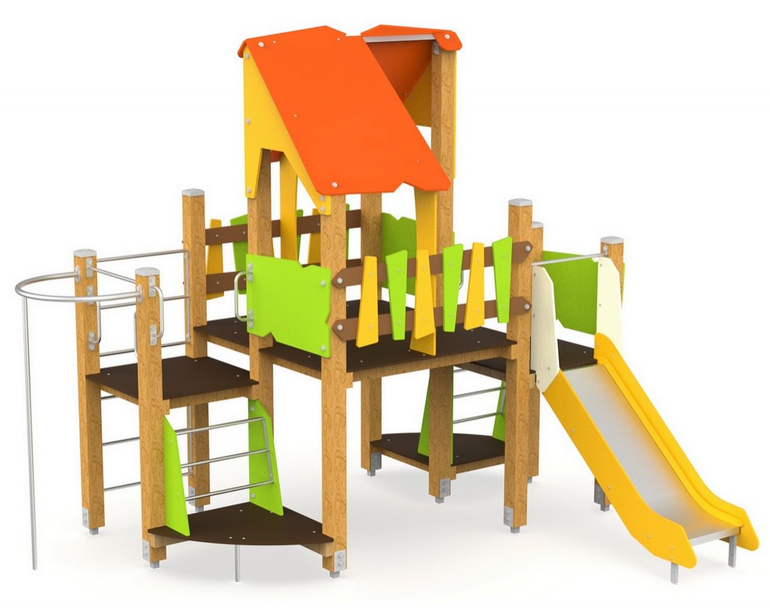 Игровой комплекс разработан с учётом безопасности и комфорта детей. Все элементы выполнены из качественных материалов, а конструкция устойчива и надёжна. Фанерные детали имеют антискользящее покрытие, что обеспечивает безопасность во время игр. Металлические элементы изготовлены из нержавеющей стали, что гарантирует долгий срок службы.