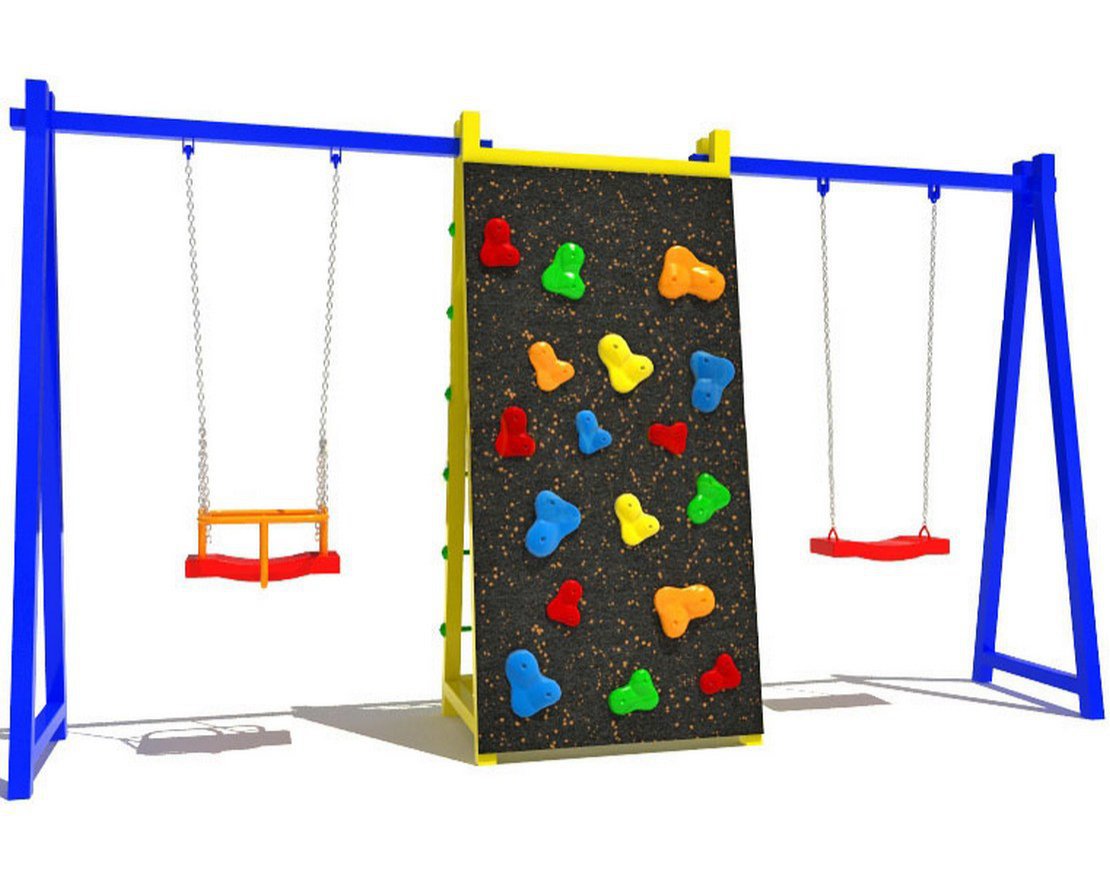 Современная детская площадка – это сочетание развлечений и пользы. Данная конструкция объединят качели – лучший источник детского удовольствия, и спортивные элементы в виде лесенки-клеточки и стены для скалолазания. Качели в детском игровом комплексе предусмотрены, как классические, так и с защитой сидения – для самых маленьких любителей прогулок.