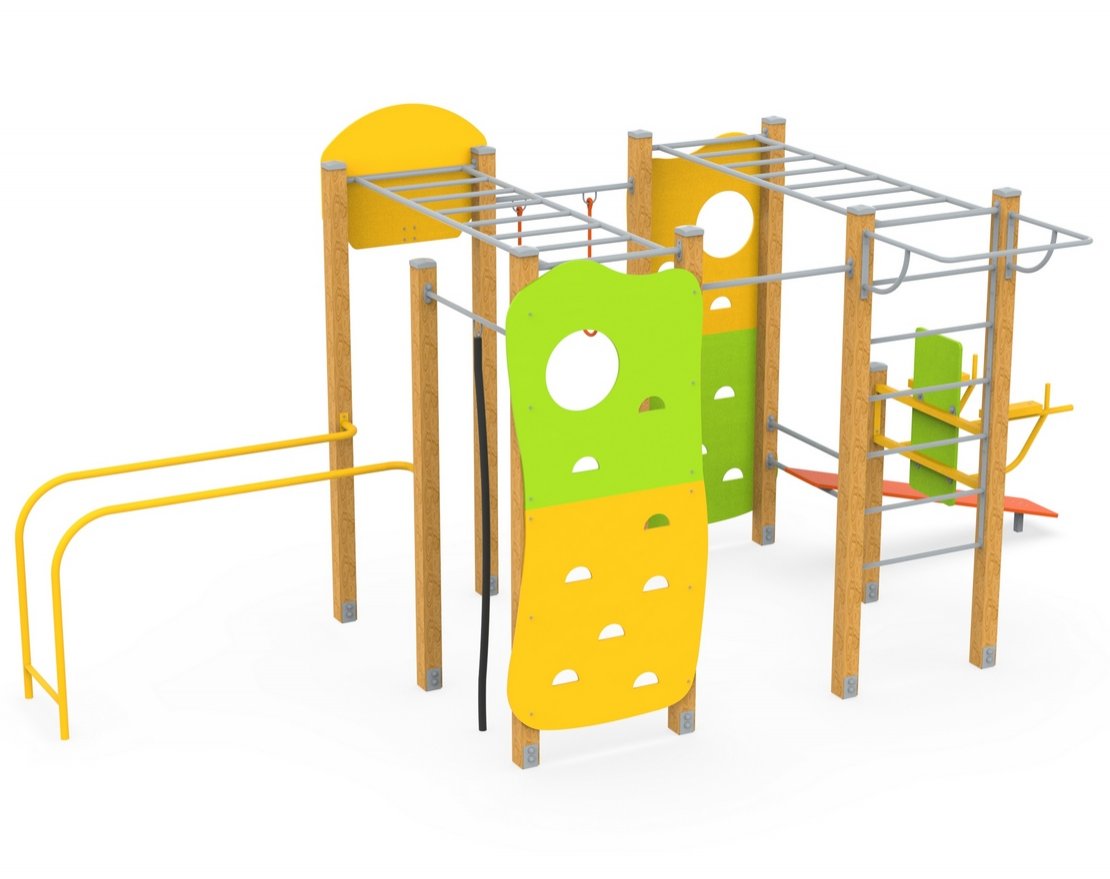 • В комплект входит: брусья, канат, гимнастические кольца, турник, шведская стенка, рукоход, баскетбольное кольцо, скалодром, скамья для пресса