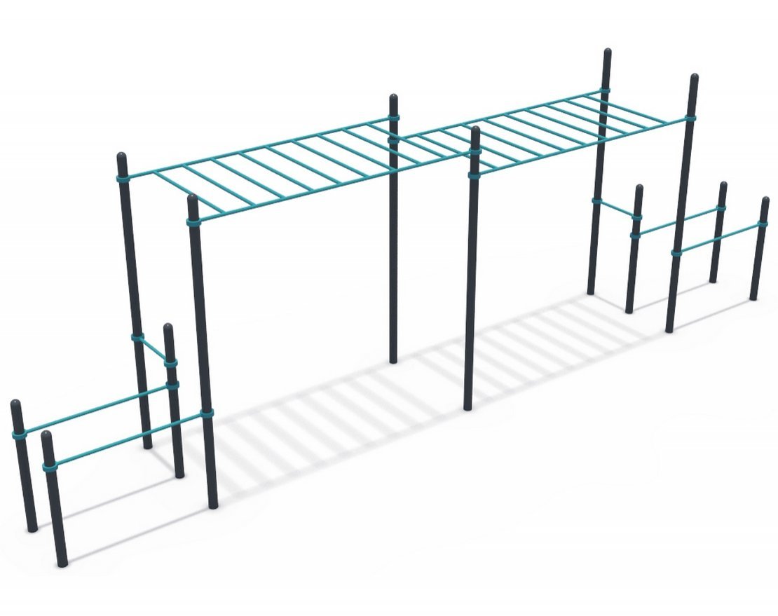 Спортивный комплекс выполнен в виде вертикальных опорных столбов, рукохода и турников.