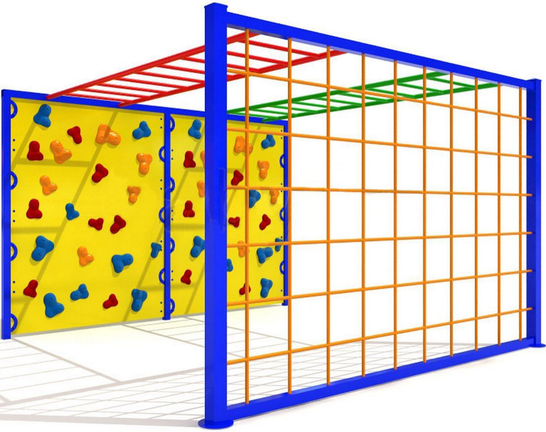 Комплекс объединяет в себе различные элементы, которые так любят дети: рукоходы, клеточную стенку и скалодром. Это позволяет малышам выбирать занятия по своему вкусу и развивать разные группы мышц.