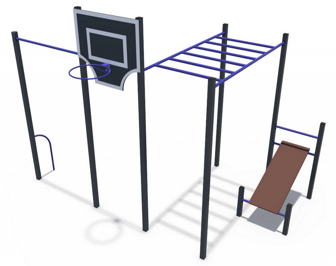 • В комплект входит: турник, рукоход, баскетбольное кольцо, скамья для пресса