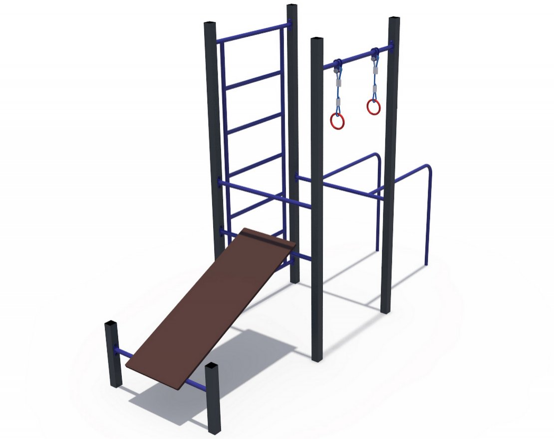 • В комплект входит: брусья, гимнастические кольца, турник, шведская стенка, скамья для пресса