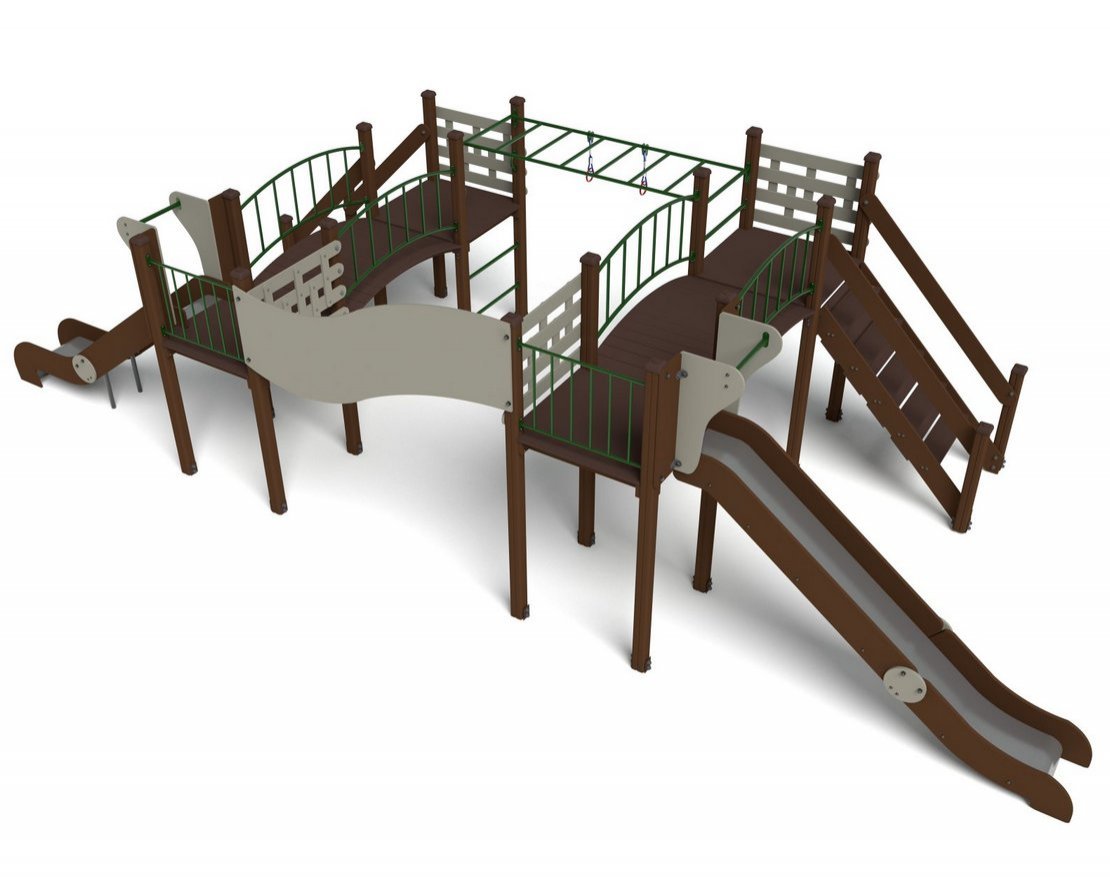Несущие столбы комплекса должны быть выполнены из клееного бруса сечением 90х90 мм. Снизу столб должен заканчиваться металлическим подпятником сечением Ø 42 мм, который бетонируется в землю. Для увеличения жесткости конструкций на опорные столбы должны крепиться лаги, собранные в шип, на которые закрепляются прогоны полов, изнутри зафиксированные специальными оцинкованными уголками. Деревянные детали должны быть тщательно отшлифованы, загрунтованы и окрашены профессиональными двухкомпонентными красками в заводских условиях. Полы площадок изготовлены из ламинированной фанеры 18 мм.