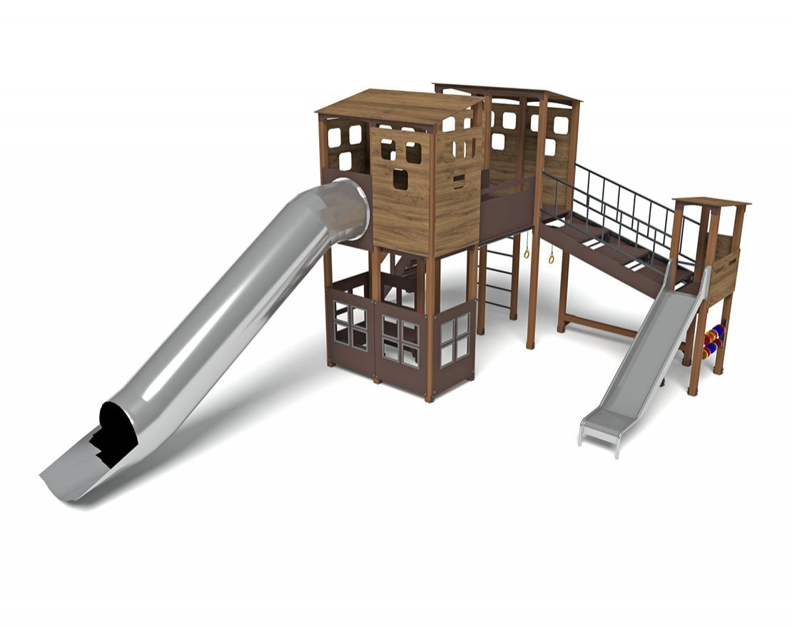 Представляем вам уличный игровой комплекс, который станет отличным местом для активного отдыха детей от 5 до 10 лет. Комплекс изготовлен из высококачественных материалов: берёзовой влагостойкой фанеры ФСФ 22, клеёного бруса и стали марки Ст3. Он имеет следующие характеристики: