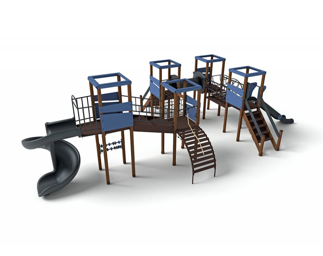 • В комплект входит: канат, гладиаторская сетка, горка, скалодром, лестница, кольцевой лаз, винтовая горка