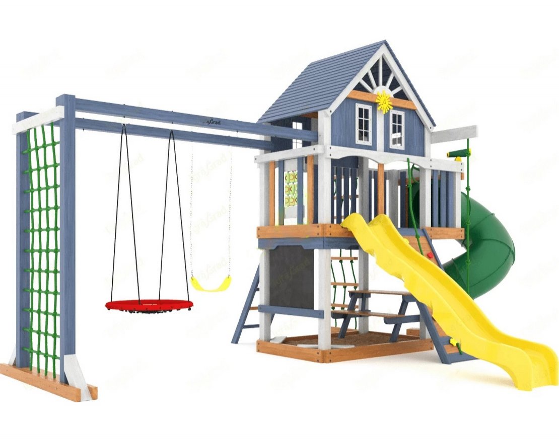 Комплекс изготовлен из высококачественных материалов, что обеспечивает его долговечность и безопасность. Металлические перила приобретаются отдельно и не входят в комплект.