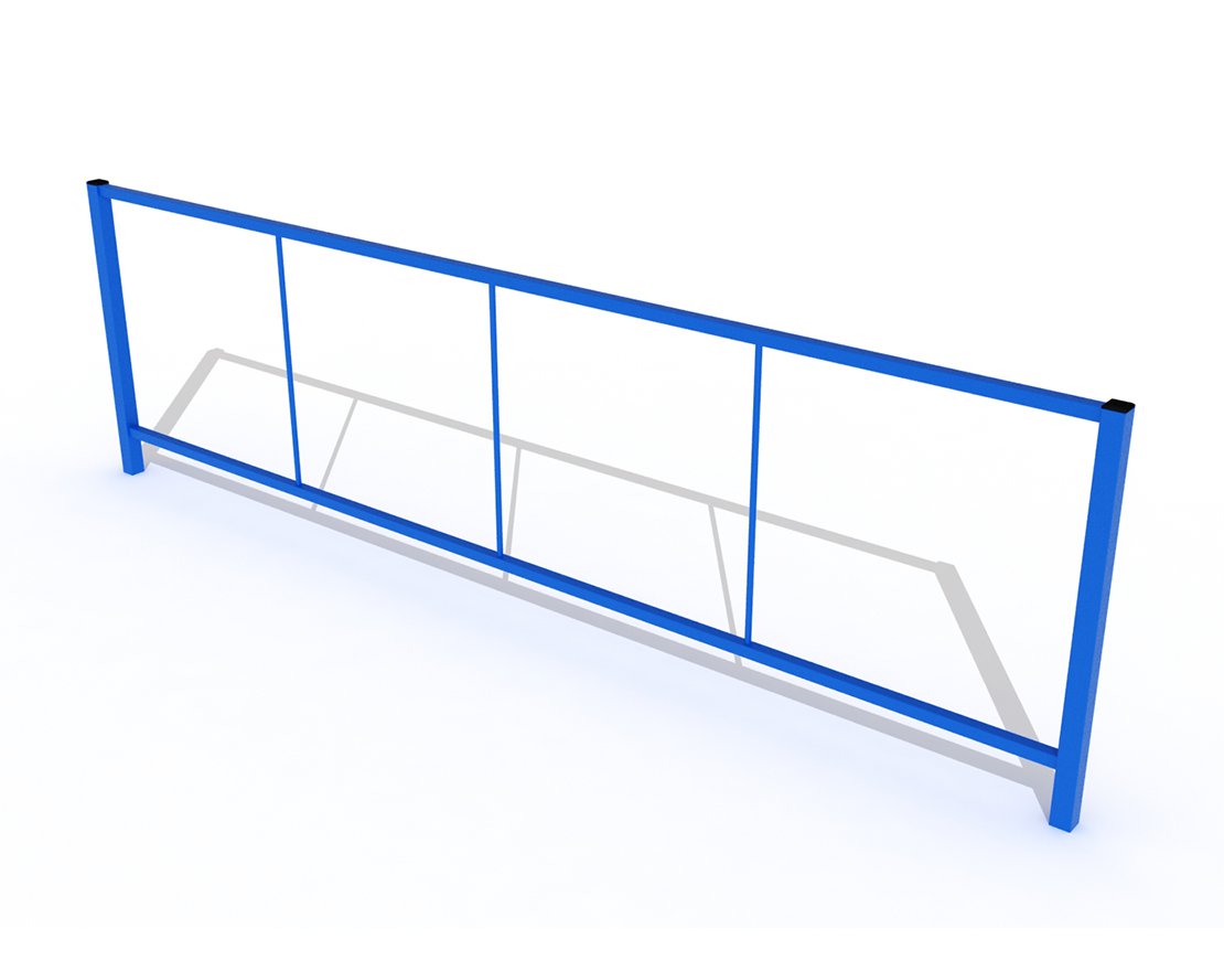 Стойки секции выполнены из профильной трубы 40х40 мм, горизонтальные перекладины из профиля 25х25 мм, вертикальные стойки из профиля 25х25 мм. Металл имеет плавные радиусы, тщательную обработку швов, покрыт порошковой краской в синий цвет.