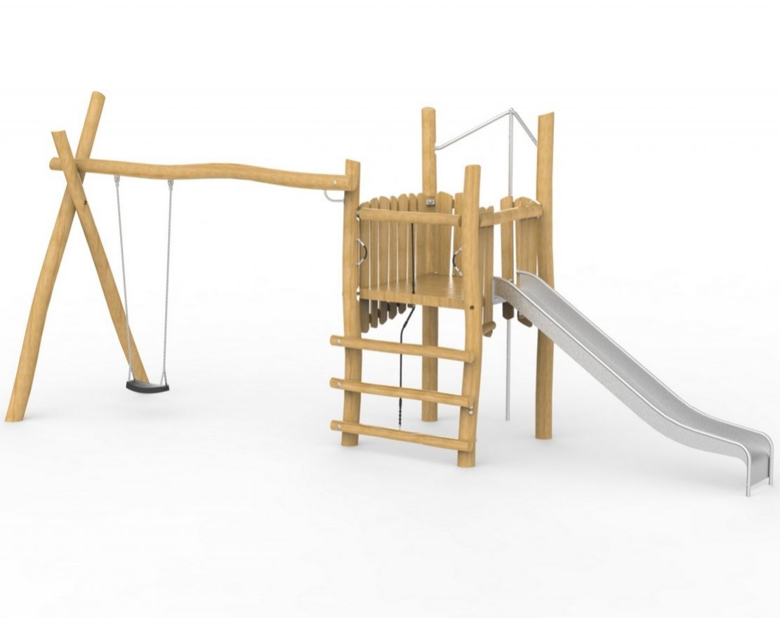 Опоры выполнены из брёвен хвойных пород, что придаёт изделию натуральный и эстетичный вид. Горка изготовлена из нержавеющей стали, что обеспечивает её долговечность и безопасность. Фурнитура выполнена из оцинкованного металла и оснащена пластиковыми заглушками.