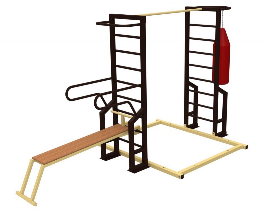 Этот комплекс включает в себя широкий турник, брусья, кронштейн для груши и другие элементы.