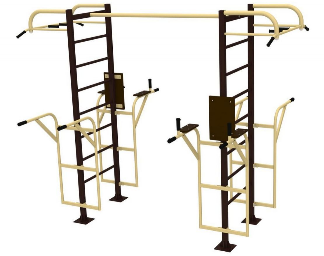 Компактный спорткомплекс подходит для установки на небольших территориях. Он разработан для развития силы и проработки всех групп мышц: бицепсов, трицепсов, мышц плечевого пояса и спины, а также для укрепления пресса.