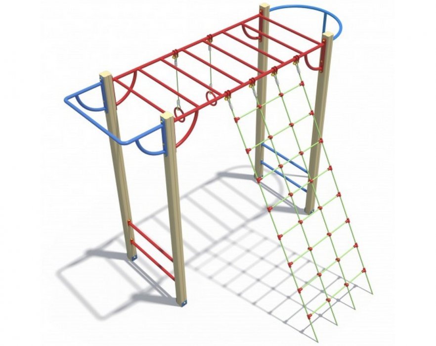 Комплекс оснащён шведской стенкой из металлических перекладин диаметром 27 мм, прямым шестом из трубы диаметром 32 мм, сеткой, рукоходом, турником, кольцами и канатом. Все элементы тщательно отшлифованы и покрыты профессиональными красками.