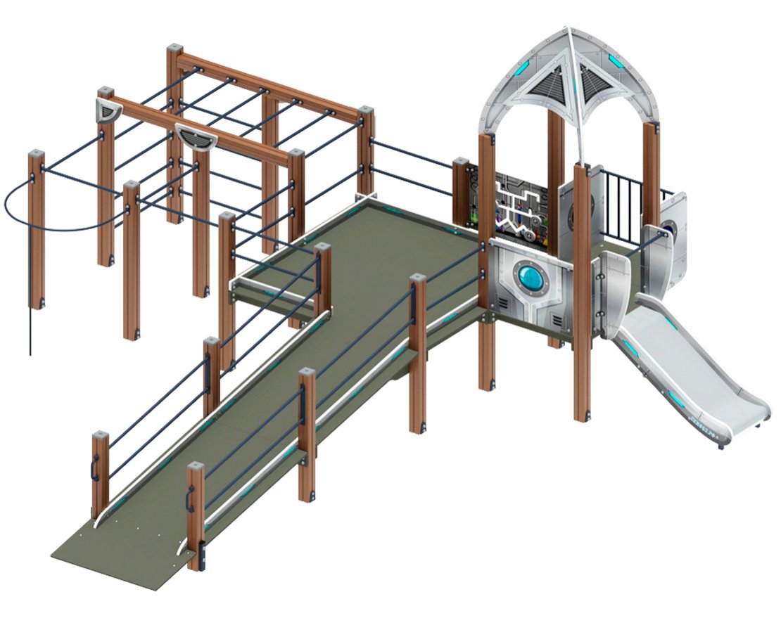 Комплекс оснащён металлическим скатом с высотой H=750 мм, который обеспечивает безопасность и комфорт во время использования.