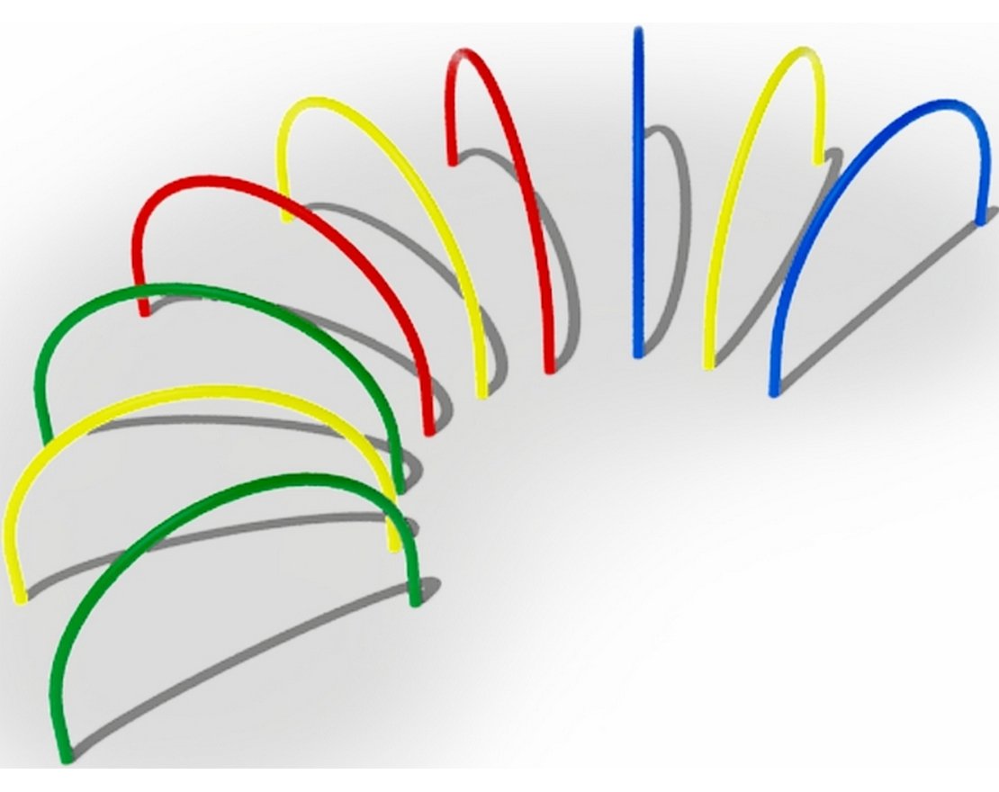 Выполнена из трубы диаметром 27 мм, металл имеет плавные радиусы, тщательную обработку швов, покрыт порошковой краской синего, красного, зеленого и желтого цвета.