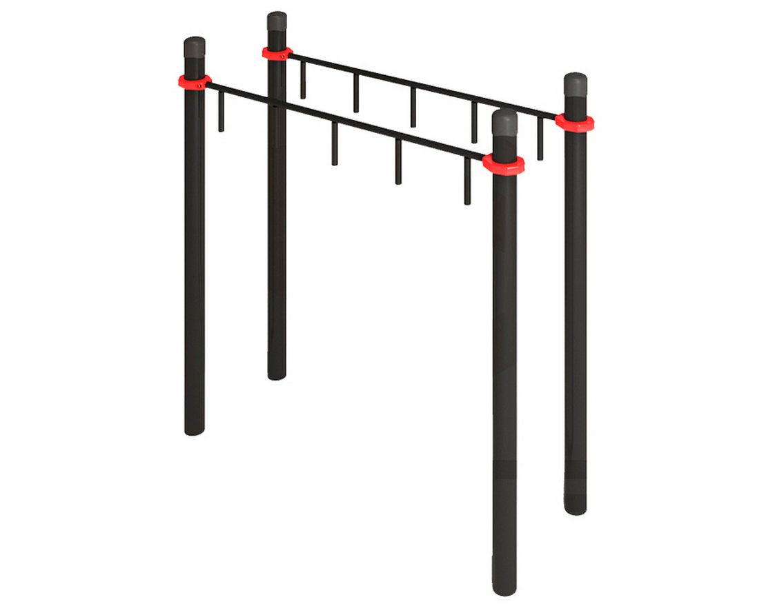 - Комплекс состоит из четырёх опорных столбов и двух рукояток, расположенных вертикально вниз.