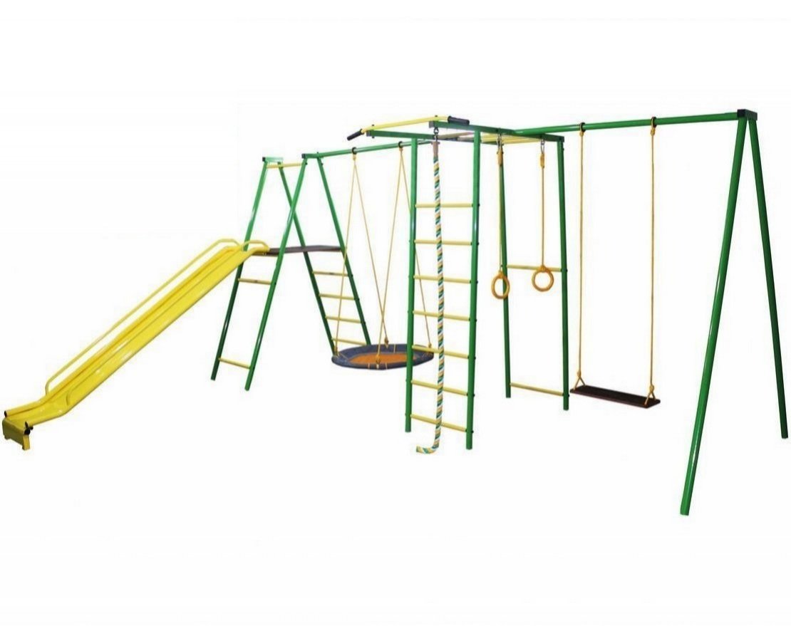 Допустимая общая нагрузка на комплекс составляет 100 килограмм. В комплектацию входят: гимнастические кольца, качели-сиденье диаметром 80 сантиметров, канат, шведская лестница, рукоход и две качели «долька», а также двухметровая горка. Стойки комплекса бетонируются, а стаканы для их установки — бетонируются.