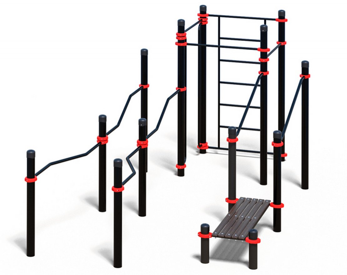 Комплекс включает в себя разнообразные элементы, которые позволяют выполнять различные упражнения на силу и ловкость. Он состоит из опорных столбов, перекладин, шведской стенки и других снарядов.
