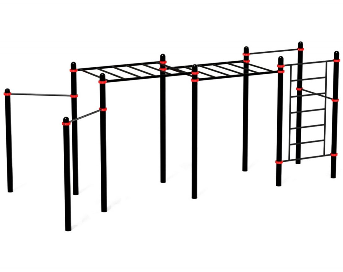 Разнообразие элементов позволяет использовать площадку для тренировок людям разных возрастов и уровней подготовки. Продуманная конструкция рукохода позволяет выбрать оптимальную высоту для занятий — 225 или 240 сантиметров. Перекладины рукохода диаметром 34 миллиметра расположены на расстоянии 33 сантиметра друг от друга. Диаметр опорных столбов составляет 7,6, 8,9 или 10,8 сантиметра, толщина стенки трубы — 3 миллиметра. Все элементы надёжно закреплены с помощью специальных хомутов.