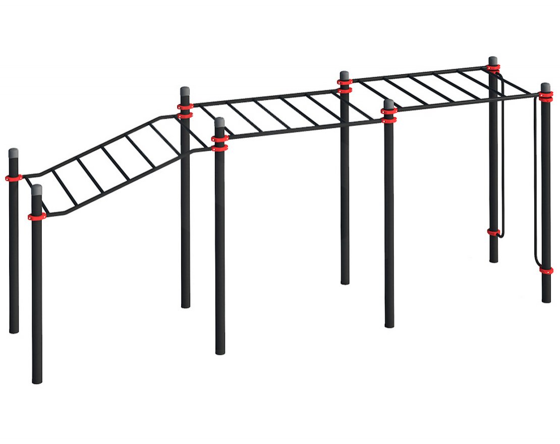На улице установлено оборудование, соответствующее приказу №87 от 17 февраля 2021 года. Разноуровневый рукоход для людей с ограниченными возможностями передвижения выполнен из круглой трубы ø76 или ø89 толщиной 3 мм или квадратной трубы толщиной 3мм. Он состоит из трёх секций, закреплённых на опорных столбах высотой 2,0 или 2,55 метра. К опорным столбами также прикреплены две горизонтальные секции рукохода высотой 235 и 245 см. Их длина составляет 1,9 метра, а шаг между перекладинами — 31 см. Нижняя часть рукохода закреплена на высоте 1,7 метра, верхняя — на высоте 2,16 метра. Общая длина рукохода — 1,8 метра.