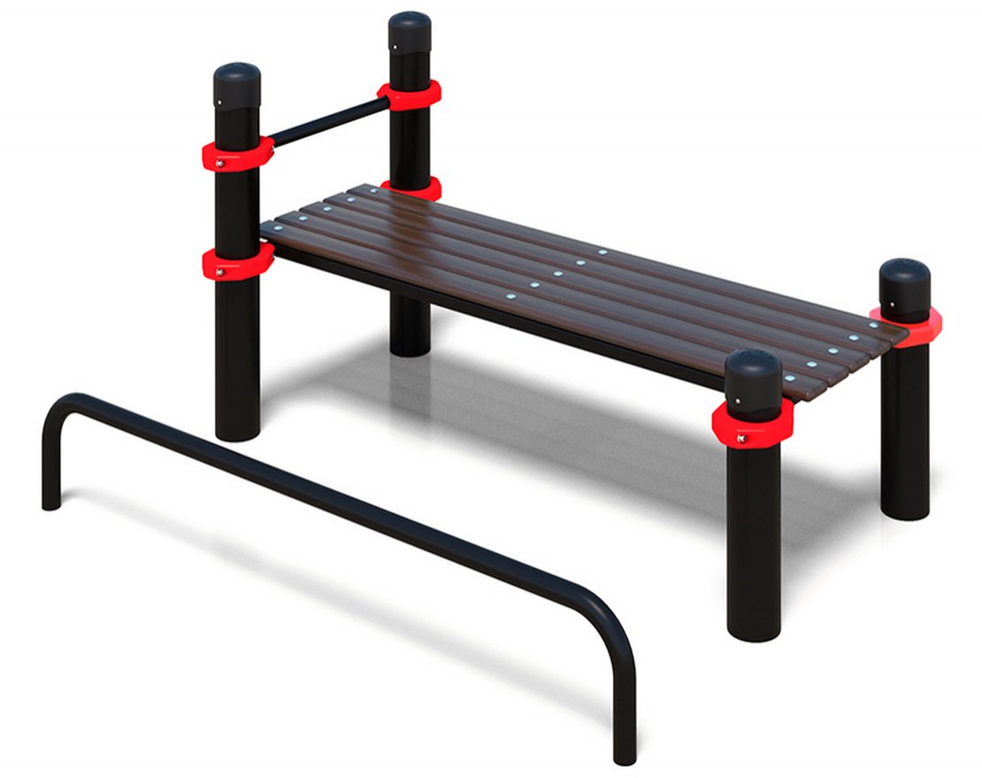 Платформа крепится к столбам с помощью хомутов, что исключает её смещение и обеспечивает высокую прочность всей конструкции. Опорные столбы изготовлены из стальных труб, окрашенных порошковым составом, который защищает их от коррозии и выдерживает большие нагрузки. Лавочка отвечает требованиям государственных норм по физической подготовке.
