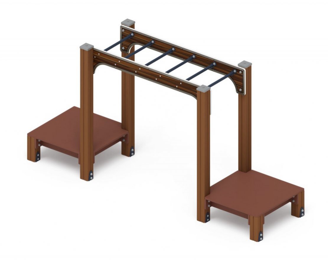 Размеры комплекса составляют 780 х 3070 х 1500 мм, а зона безопасности — 3780 x 6070 мм. Это обеспечивает достаточно пространства для активных игр и занятий спортом. Кромки элементов комплекса тщательно отшлифованы и закруглены, что исключает возможность получения травм.