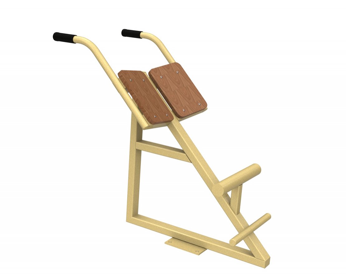 Уличный тренажёр «Гиперэкстензия» — это изделие из прочной стали, предназначенное для тренировки мышц спины и укрепления мышечного корсета позвоночника. Тренажёр имеет закруглённый валик, рифлёные рукоятки и упоры из пластика. Он рассчитан на одного пользователя.