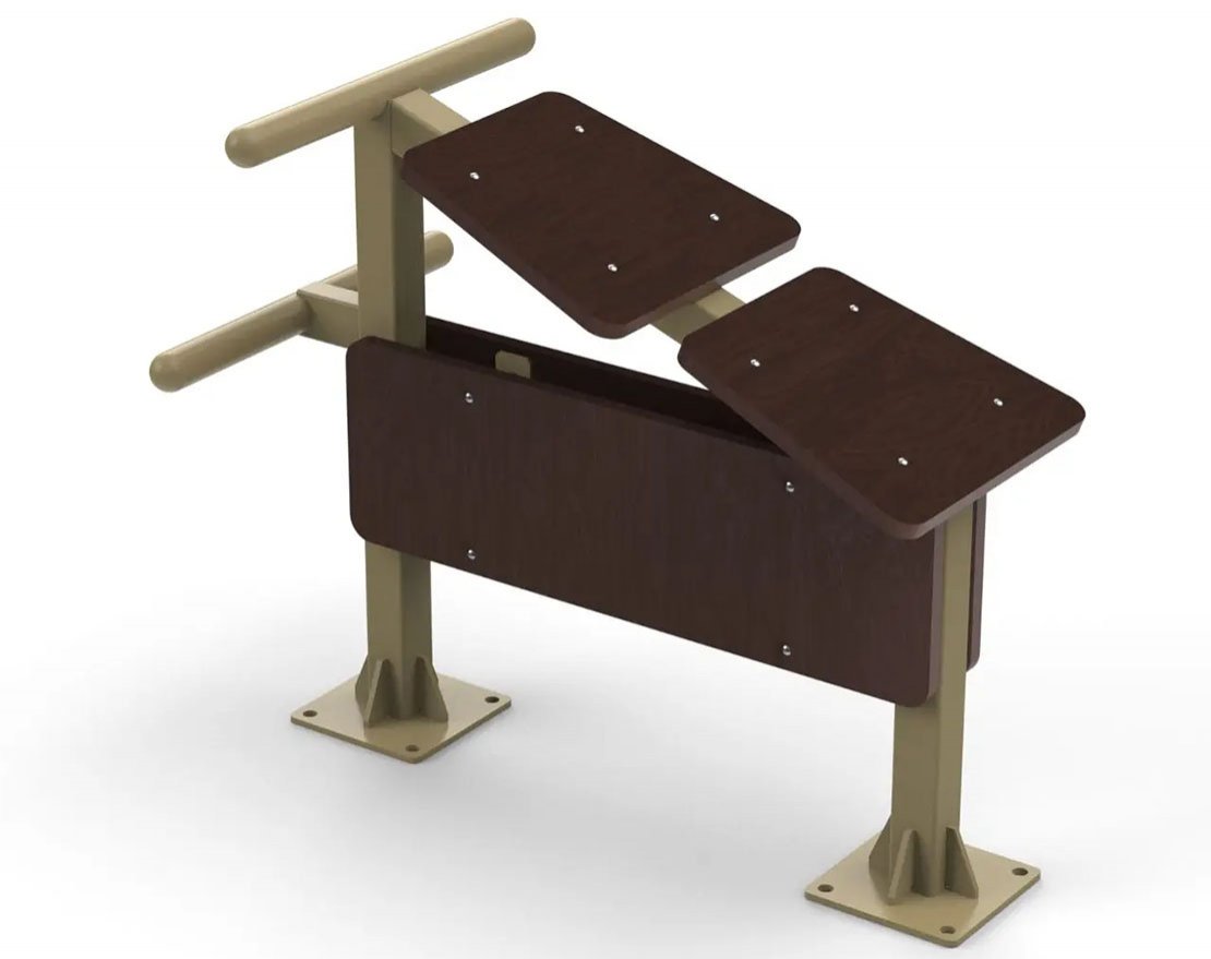 Уличная скамья для пресса изготовлена из прочной стали и обладает высокой устойчивостью к износу. Закруглённый валик обеспечивает удобную фиксацию ног во время тренировки.