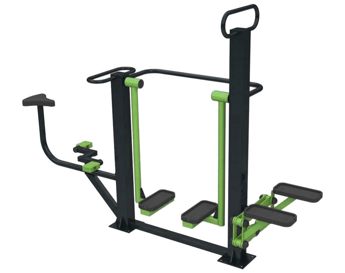 Уличный тренажёр «Степовелошагоход» — это комплекс для тренировки разных групп мышц и улучшения физической формы. Он состоит из трёх элементов: степпера, велосипеда и шагохода. Тренажёр изготовлен из прочной стали и рассчитан на одновременную тренировку трёх пользователей.