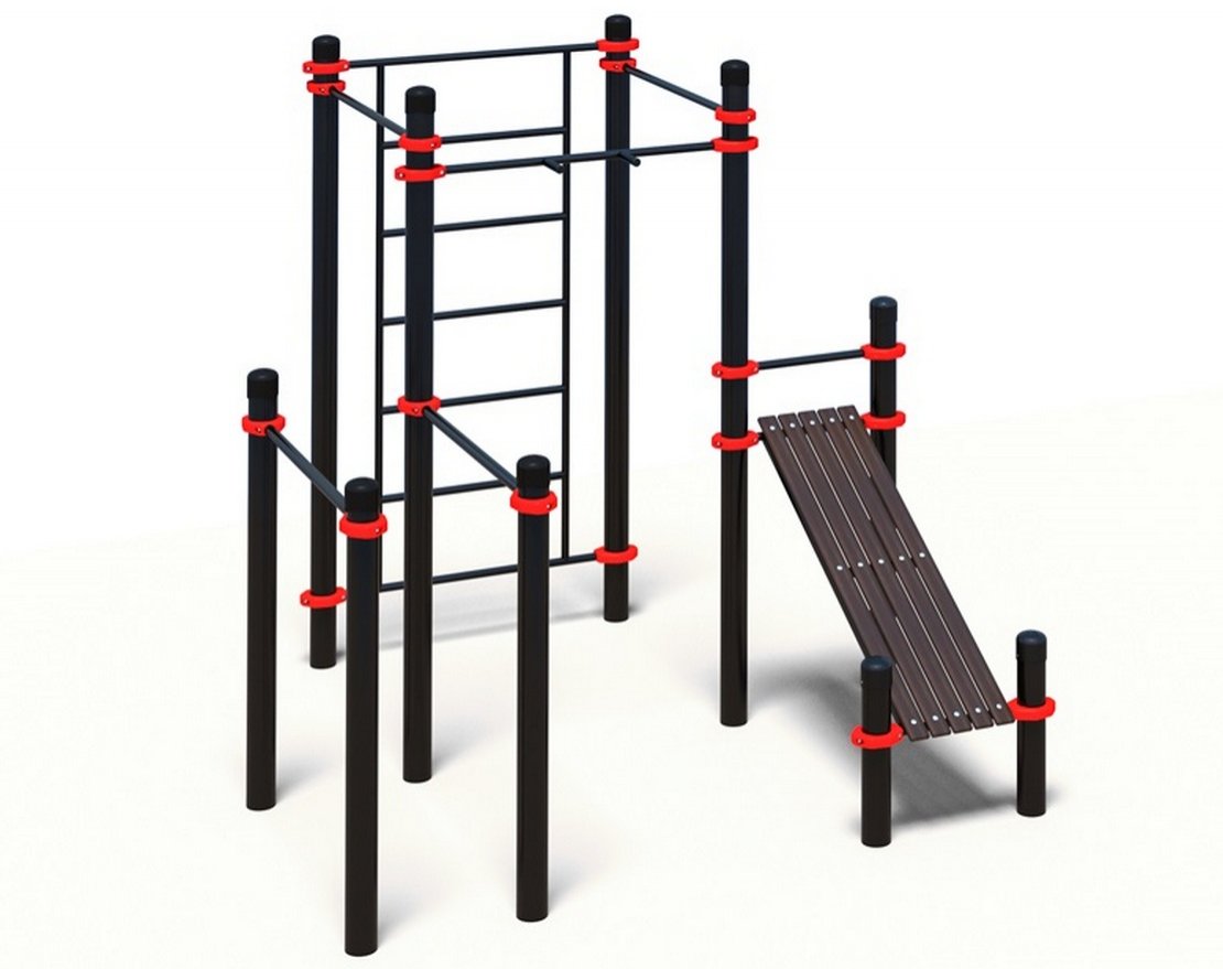 Лавка для пресса имеет уклон, позволяющий выполнять упражнения с комфортом. Две параллельные жерди для отжиманий диаметром 48 мм обеспечивают возможность тренировки различных групп мышц верхней части тела.