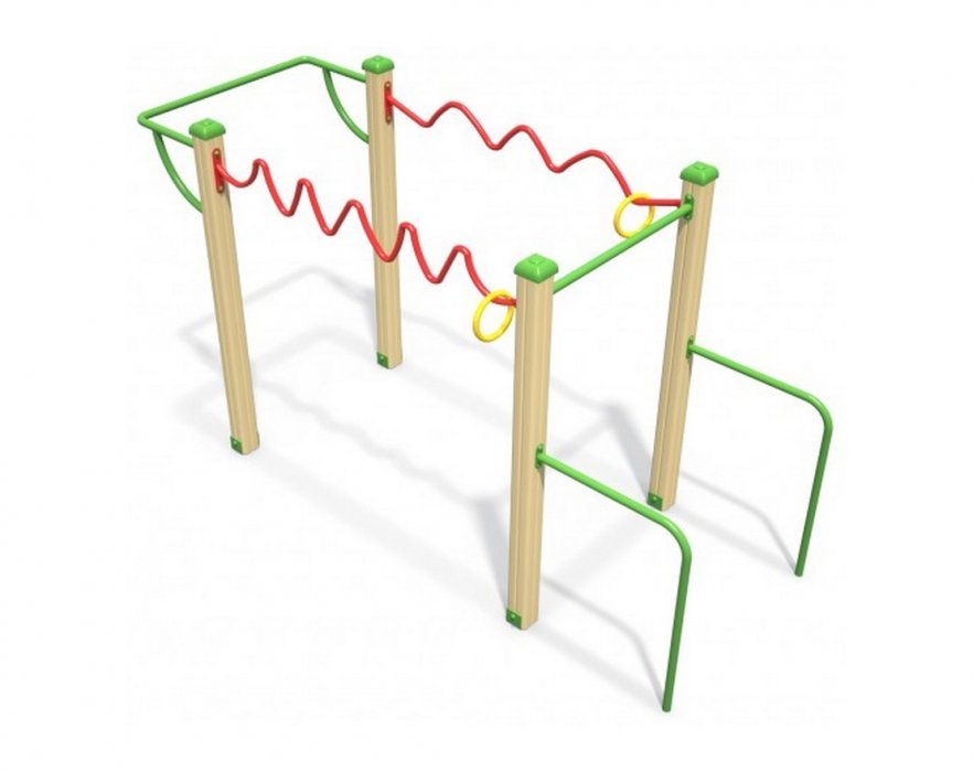 В состав комплекса входят турник, брусья и игровой модуль для развития моторики. Размеры комплекса: длина — 310 см, ширина — 100 см, высота — 150 см. Зона безопасности составляет 610×400 см.