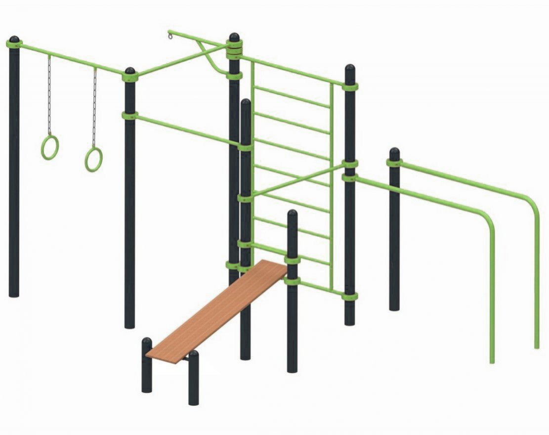 Комплекс состоит из нескольких элементов: турника, брусьев, скамьи для пресса, шведской стенки, гимнастических колец и подвеса для груши. Все эти элементы отлично дополняют друг друга и обеспечивают разнообразные возможности для тренировок.
