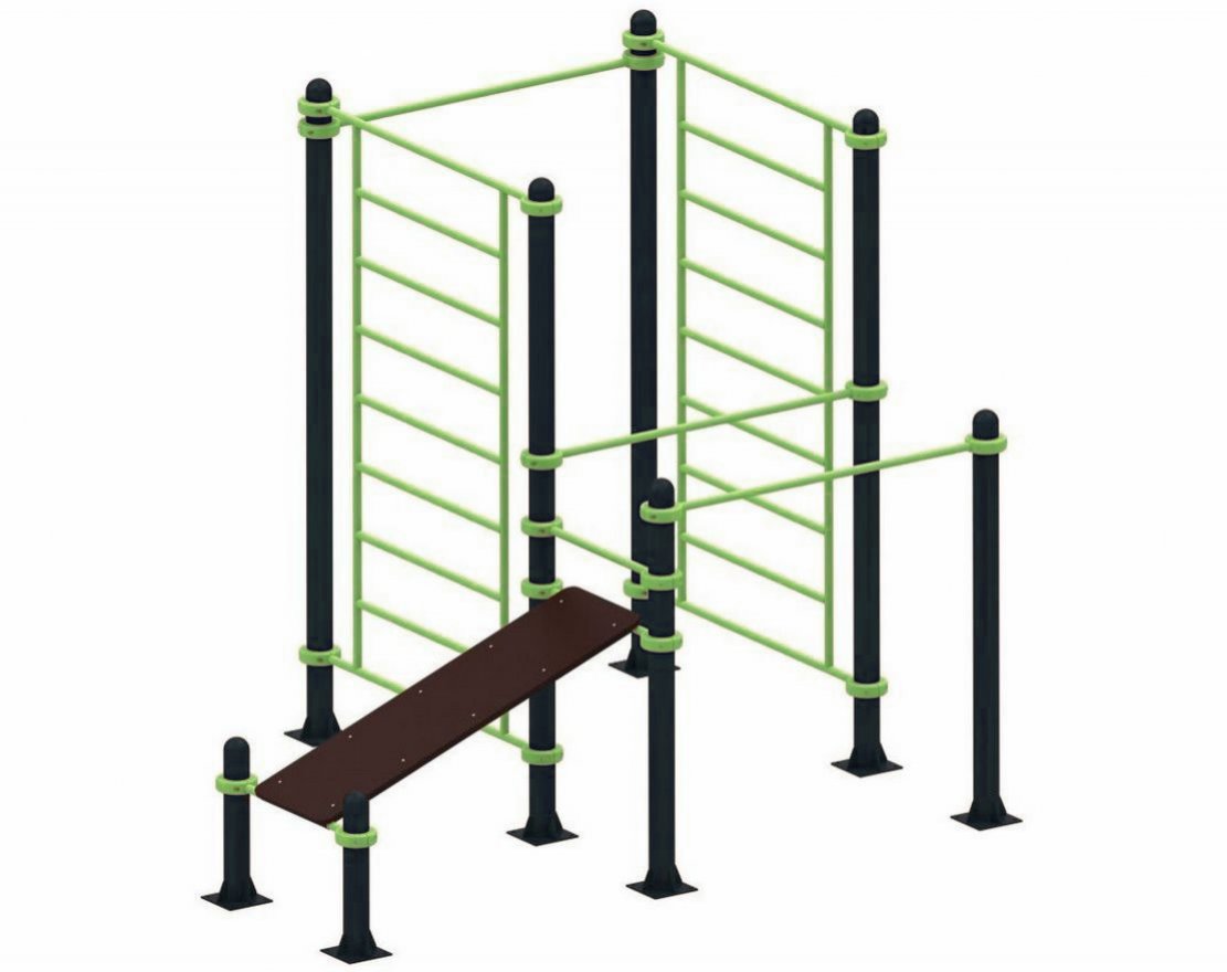 Площадка для воркаута, установленная с помощью хомутов на выбранной территории, представляет собой функциональный и эстетичный уличный спортивный комплекс. В состав комплекса входят: